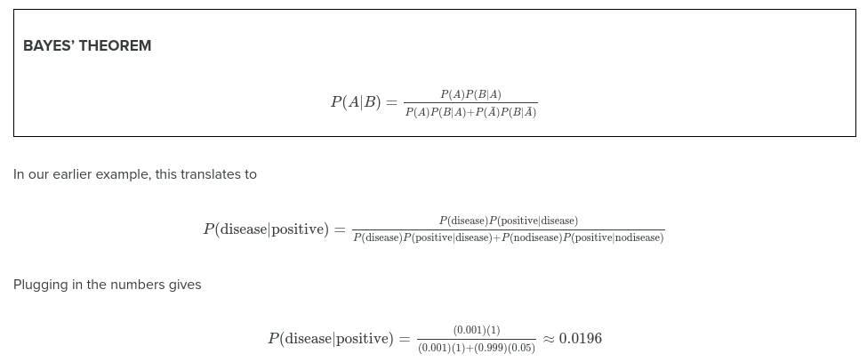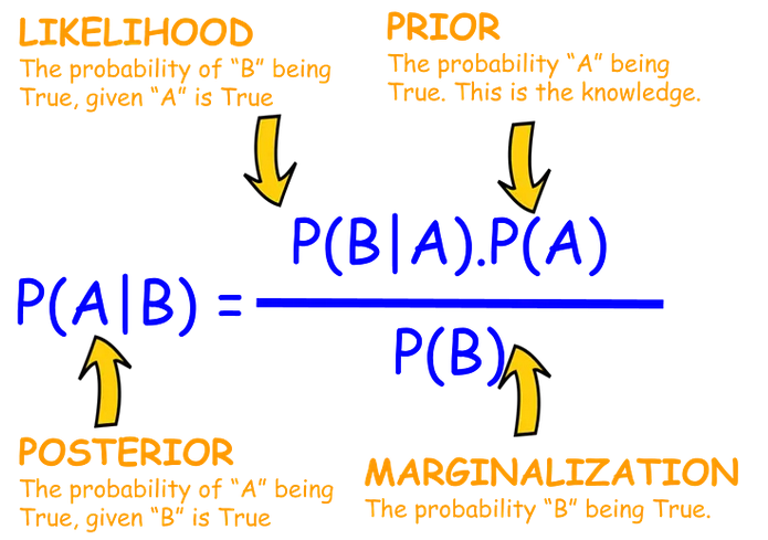\(P(A|B) = \frac{P(B|A)\times P(A)}{P(B)}\)