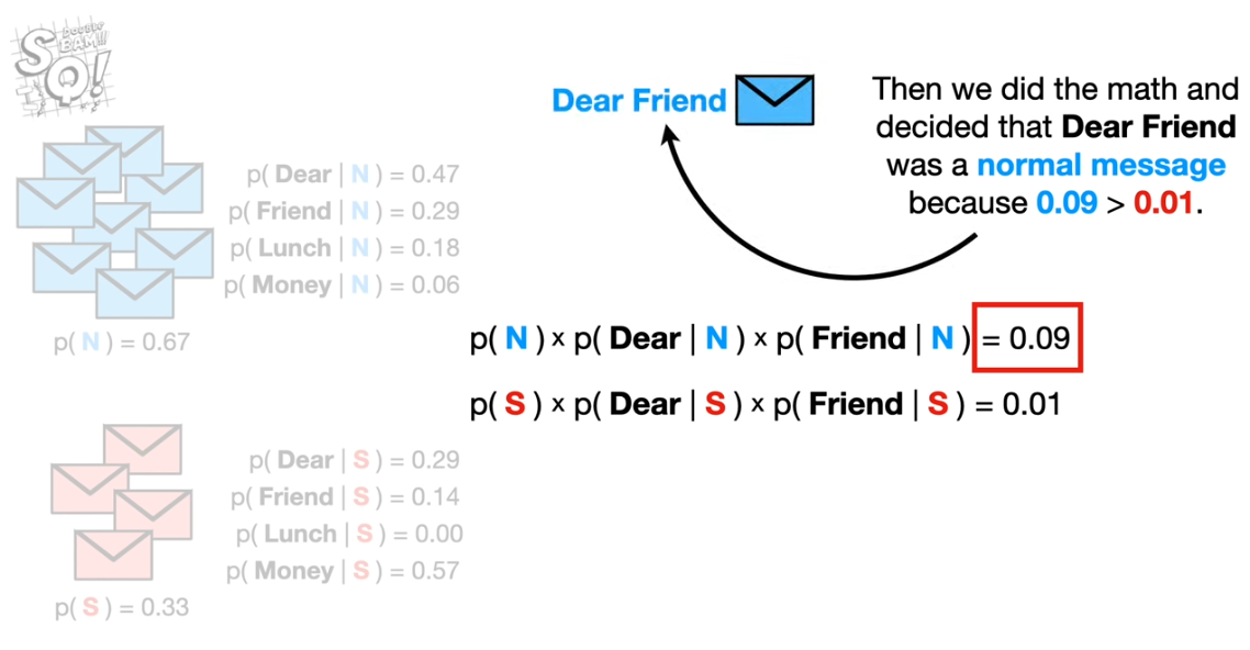 Resulting probabilities are proportional to the probability of being normal or spam; so take the highest probability.